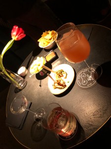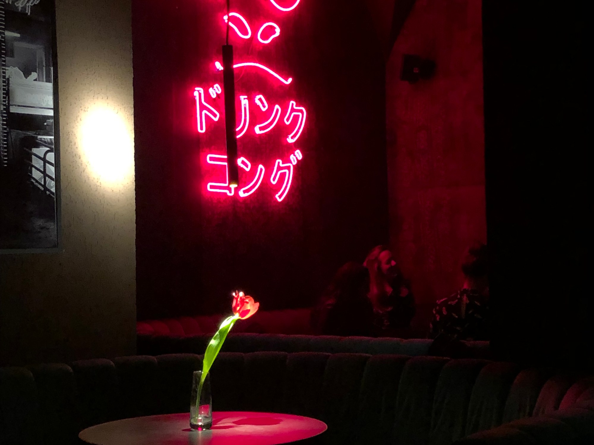 It’s a dramatic and slick interior. There’s a gorgeous bar in the front, but we were seated in a plush booth in the back, where it was very dark and clubby. Pops of bright color here and there keep the eye entertained. Each table had a single fresh tulip lit by a tiny spotlight. They are clearly going for an Instagram-worthy effect. It works, judging by the number of guests taking countless selfies.