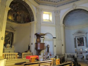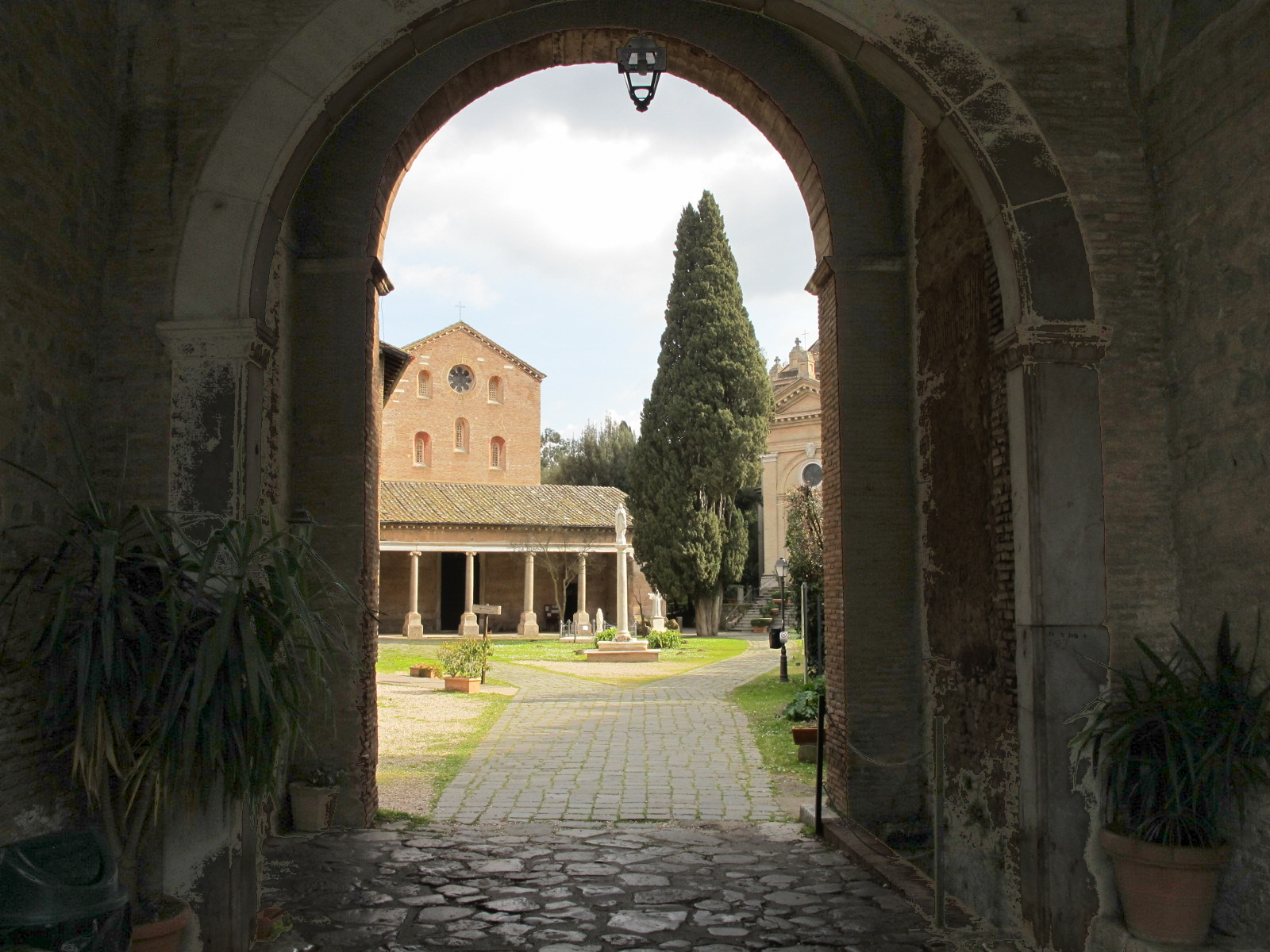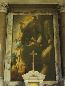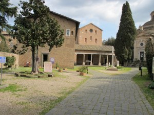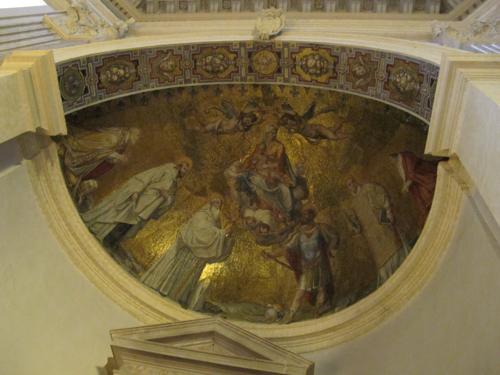 The first church you come to is the simplest, but still lovely — Santi Vincenzo e Anastasio alle Tre Fontane. Originally built by Pope Honorius I in 626 C.E., this peaceful church and attached monastery are dedicated to Saints Vincent and Anastasius. The Persian Saint Anastasius (well, his head) showed up first in the 7th century. The relics of Saint Vincent, who was from Spain, showed up in the 14th century. The church we see at this abbey dates from the 1200’s, when the front portico and wonderful wooden roof were added. The interior is vast, plain, and cool — and entirely peaceful. We were there with just one woman, who was quietly praying.