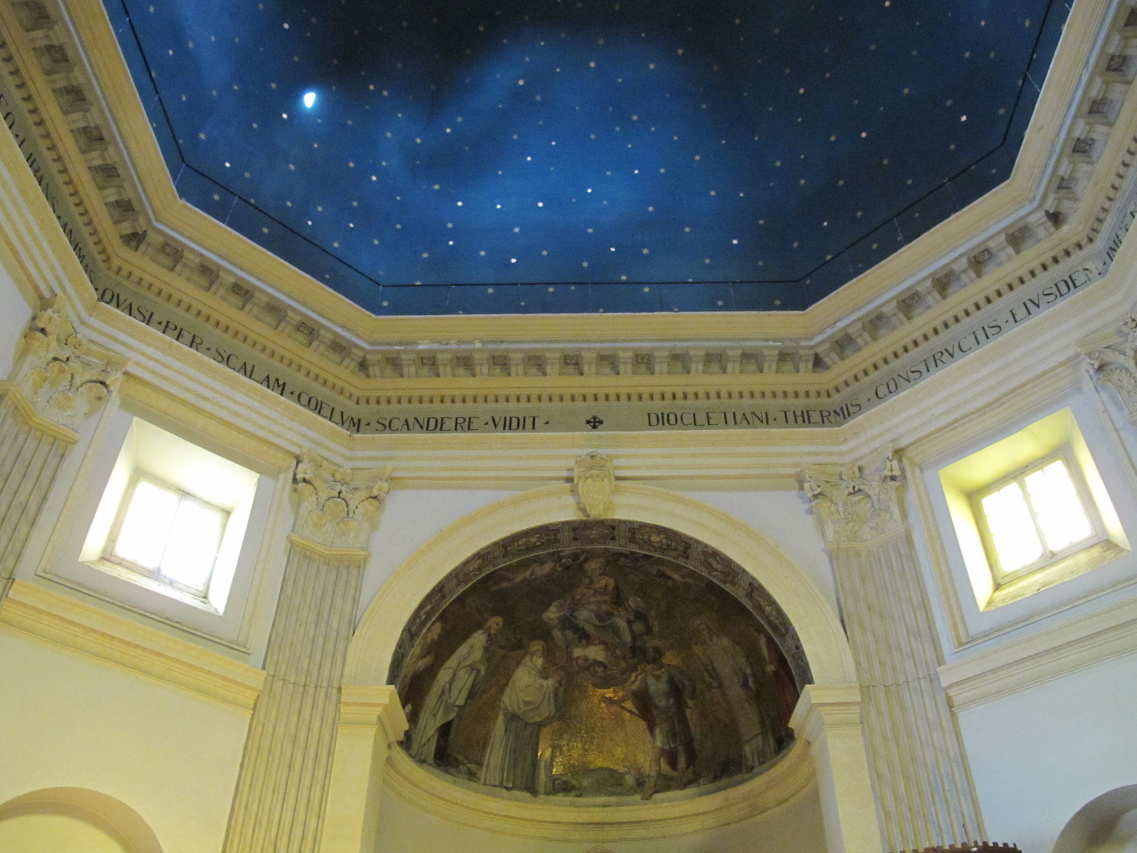 Although Santa Maria is much older, the current structure dates from the 16th century and was designed by none other than Giacomo della Porta. We had the place to ourselves. It’s a pretty and cozy church, octagonal in shape, with a blue ceiling replete with gold stars. This church is said to hold the relics of Saint Zeno and the 10,203(!) slaves who were forced to build the Baths of Diocletain and then slaughtered after completing their task in 299 C.E.
