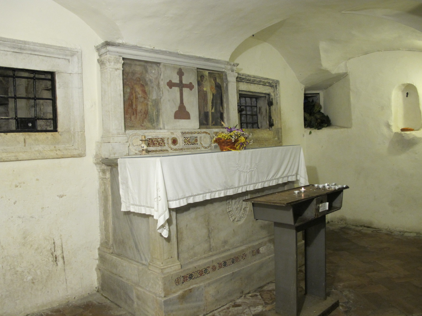Behind the crypt’s altar are two tiny and primitive cells. You can view them through barred windows shown in the picture above. In one cell there is an altar that apparently was to a pagan goddess (which you get used to in Rome since early Christians built on top of ancient pagan structures). Legend says that Paul the Apostle was imprisoned in the other cell while awaiting his execution. This bit brings us to the name of this lovely abbey… which I will discuss in my next post.