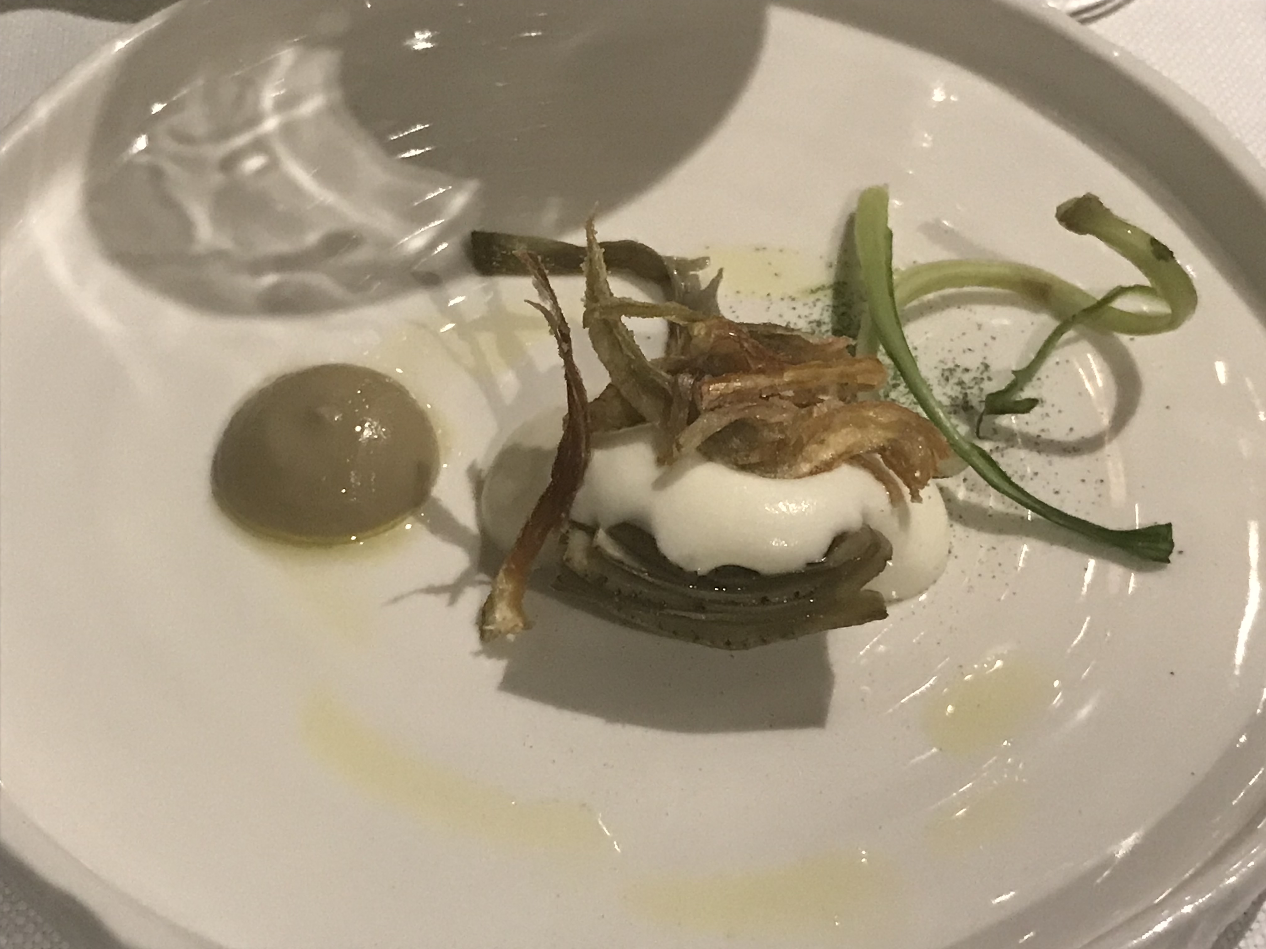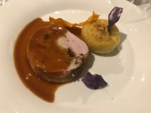 The next course was a pumpkin and sheep’s milk ricotta cheese timbale on leek cream with crispy guanciale on top.
