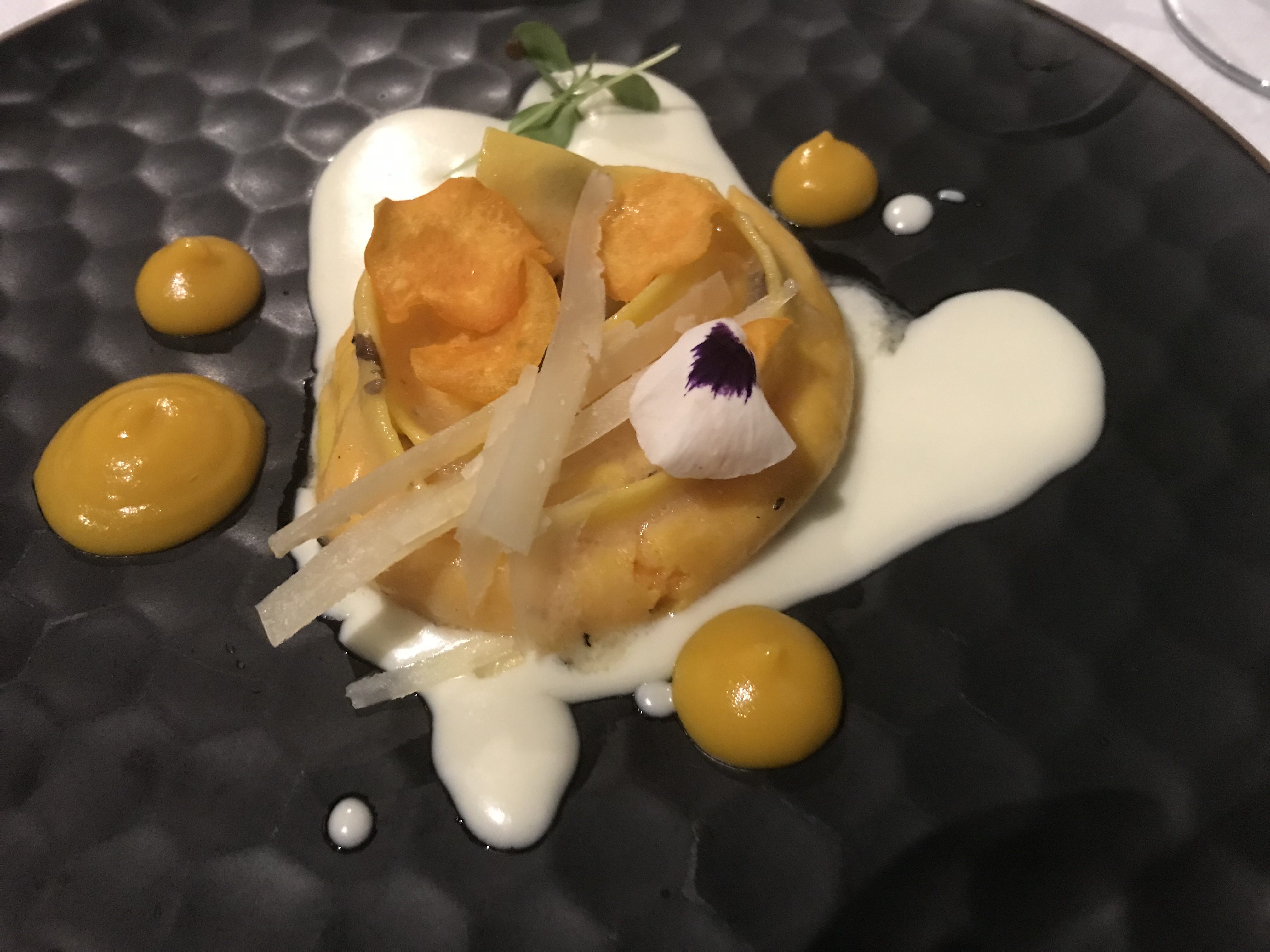 Of course, there must be a pasta course. Ours was ravioli stuffed with sweet potato, with bit of truffle and Pecorino — warm and soothing, and perfect for the season.