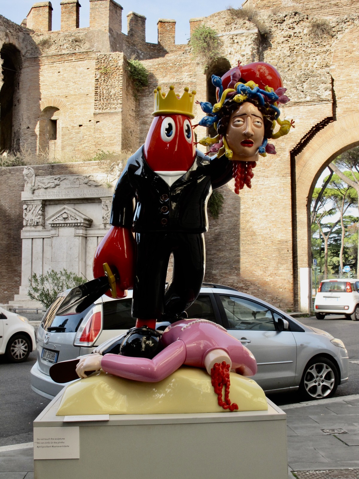 We are continuing to enjoy the art installations on Rome’s famed and beloved Via Veneto, just a short walk away from the apartment. Last time we were here, there were weird art installations, such as a giant water bottle with legs, from Austrian artist Erwin Wurm.