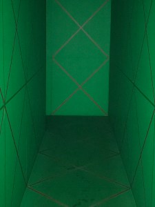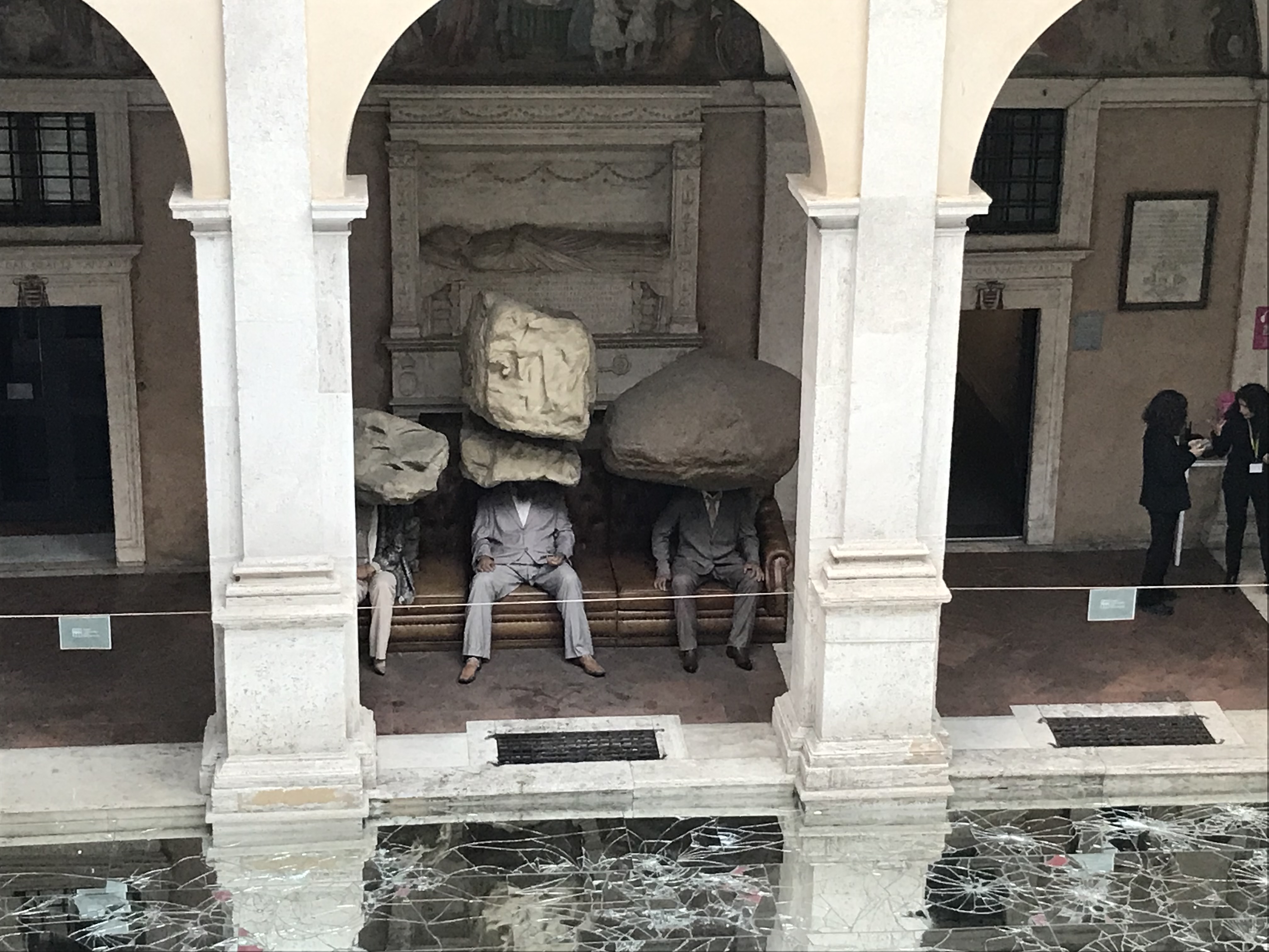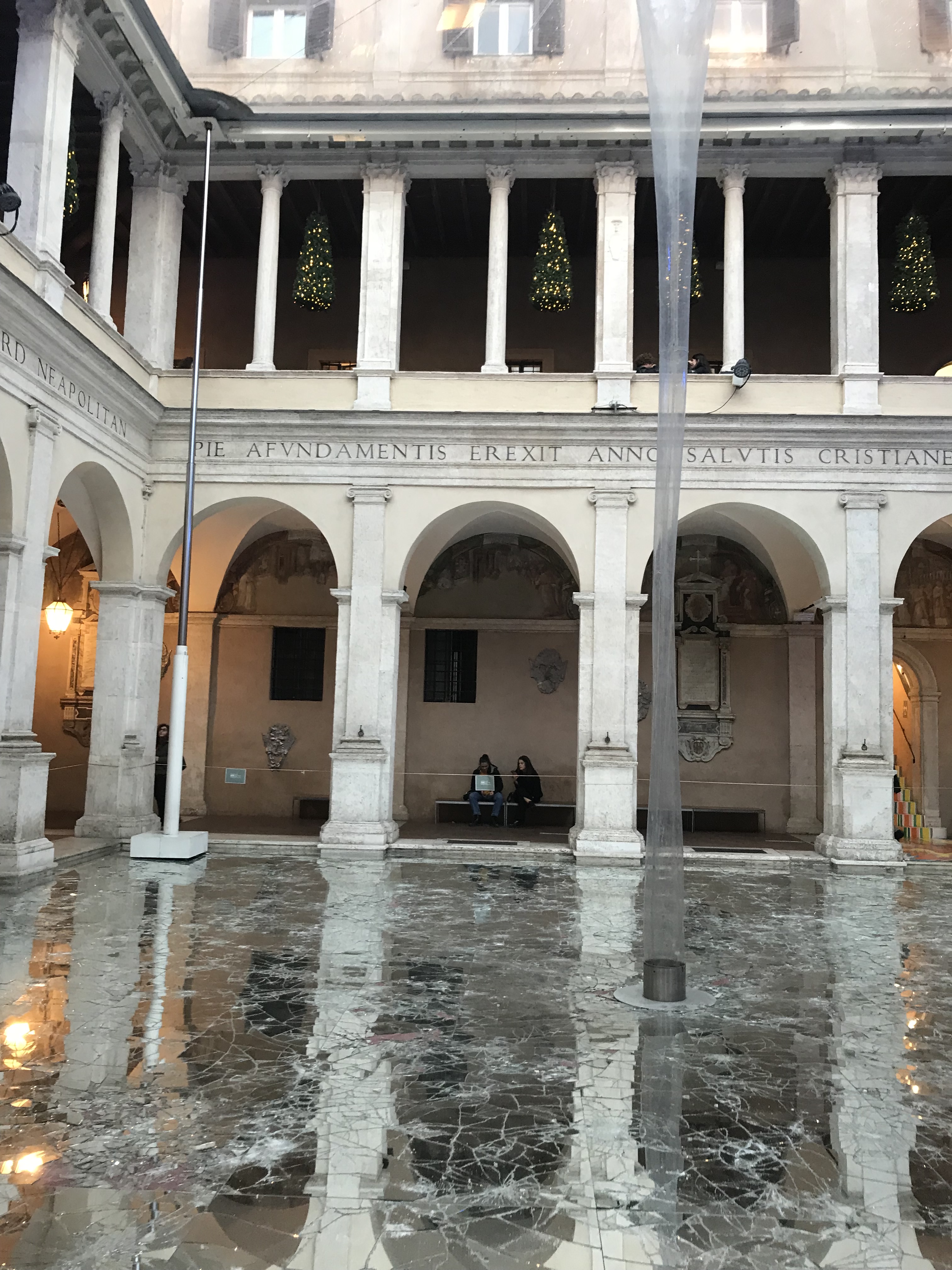 Before you enter the CRAZY exhibition space, the first installation you encounter is on the courtyard floor, which has been covered with mirrors. Most of them are shattered, which creates a beguiling visual and image. The visual: the floor looks like it’s made of ice. The image: then you see the really interesting effect of the reflections of the cloister in the mirrors.
