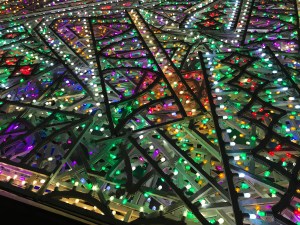Then you get to this installation, which is gorgeous, in a large darkened room. On the floor are a series of stacked frames with thousands of flickering lights — quite mesmerizing to experience.