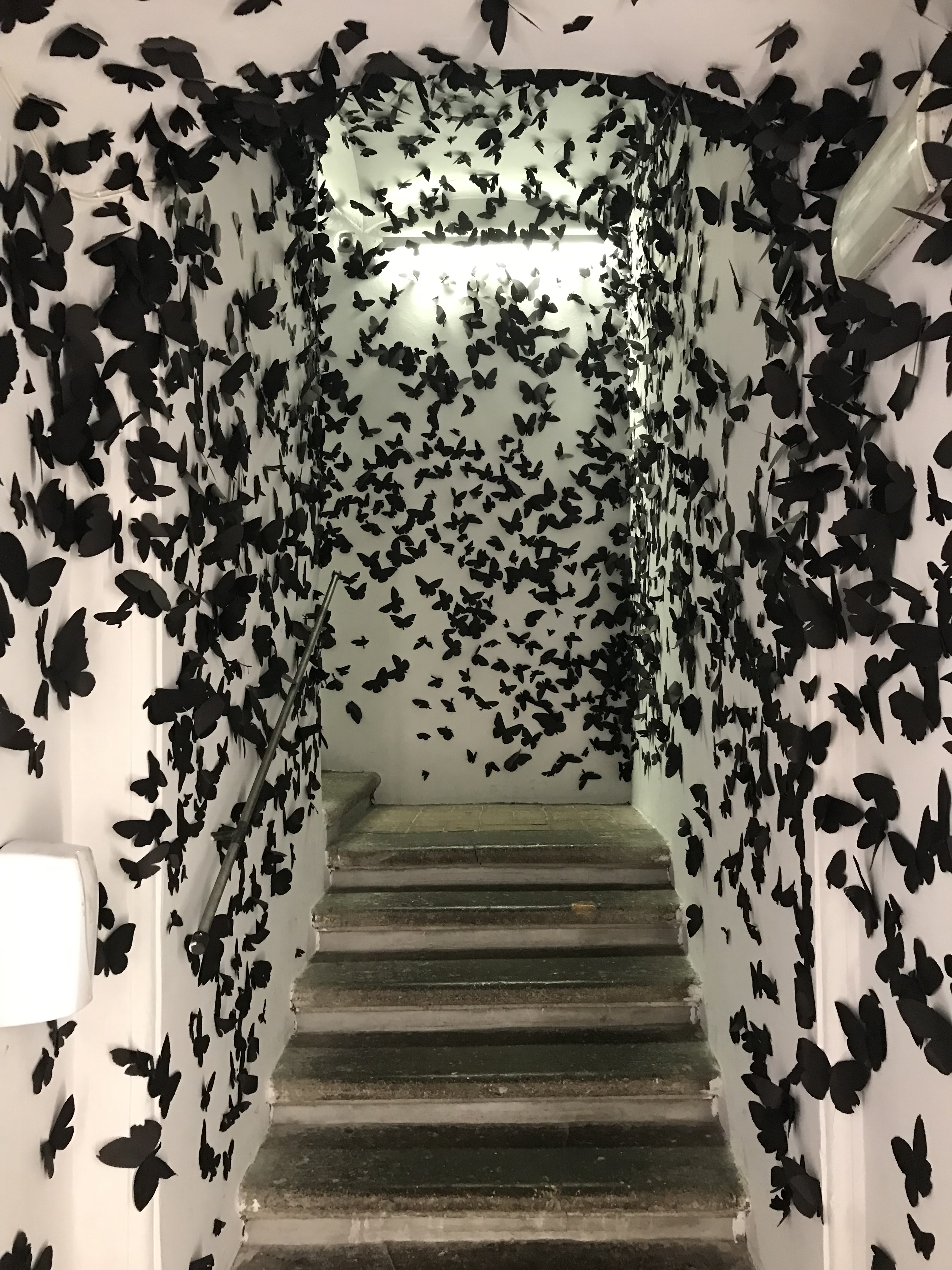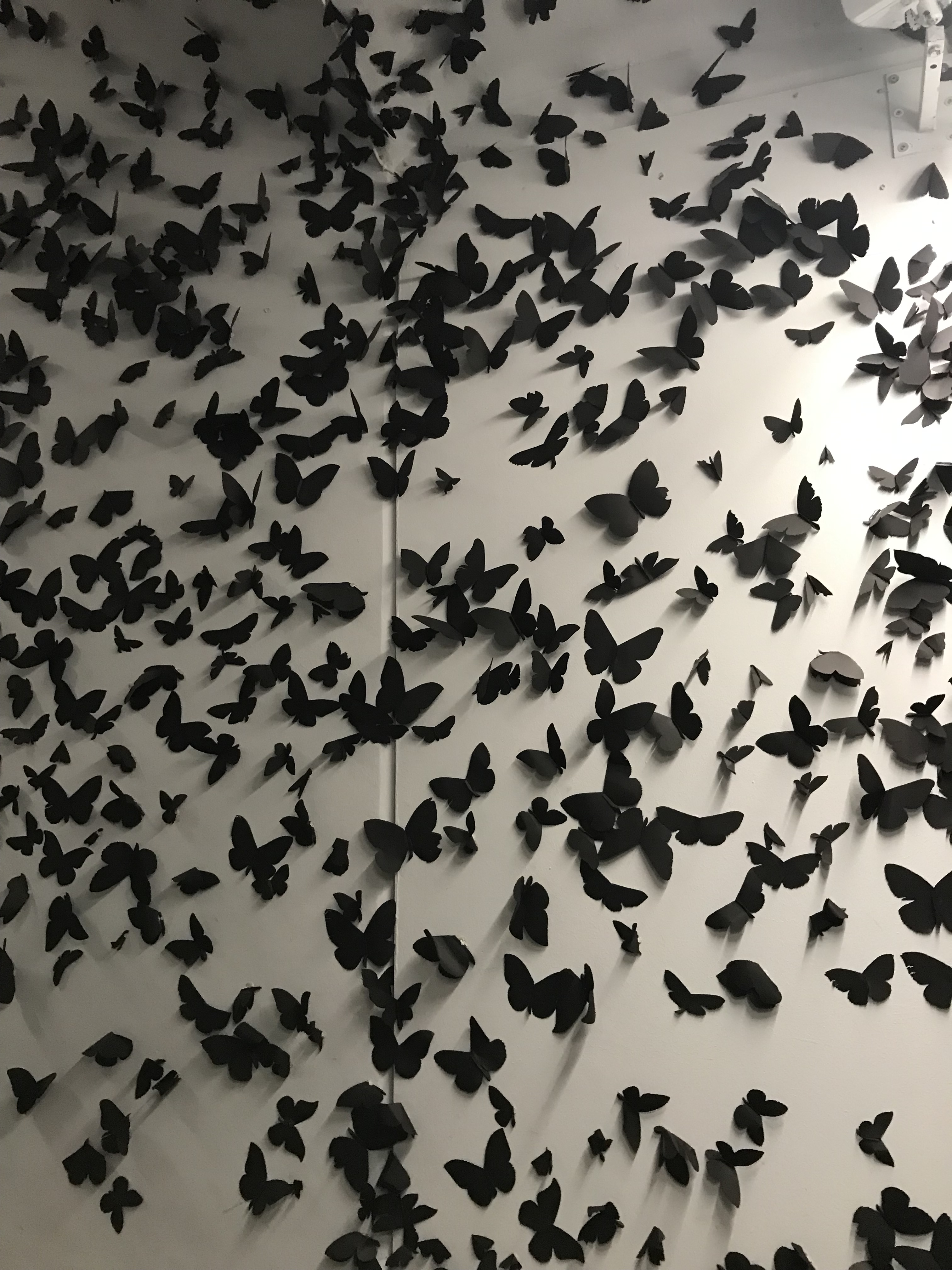 Another installation that hit a home run for us is in the stairwell leading up through the exhibit, featuring thousands of black cut-outs of butterflies that apparently reflect a memory of the artist. It feels like you are walking though a cloud of these lovely insects.