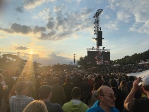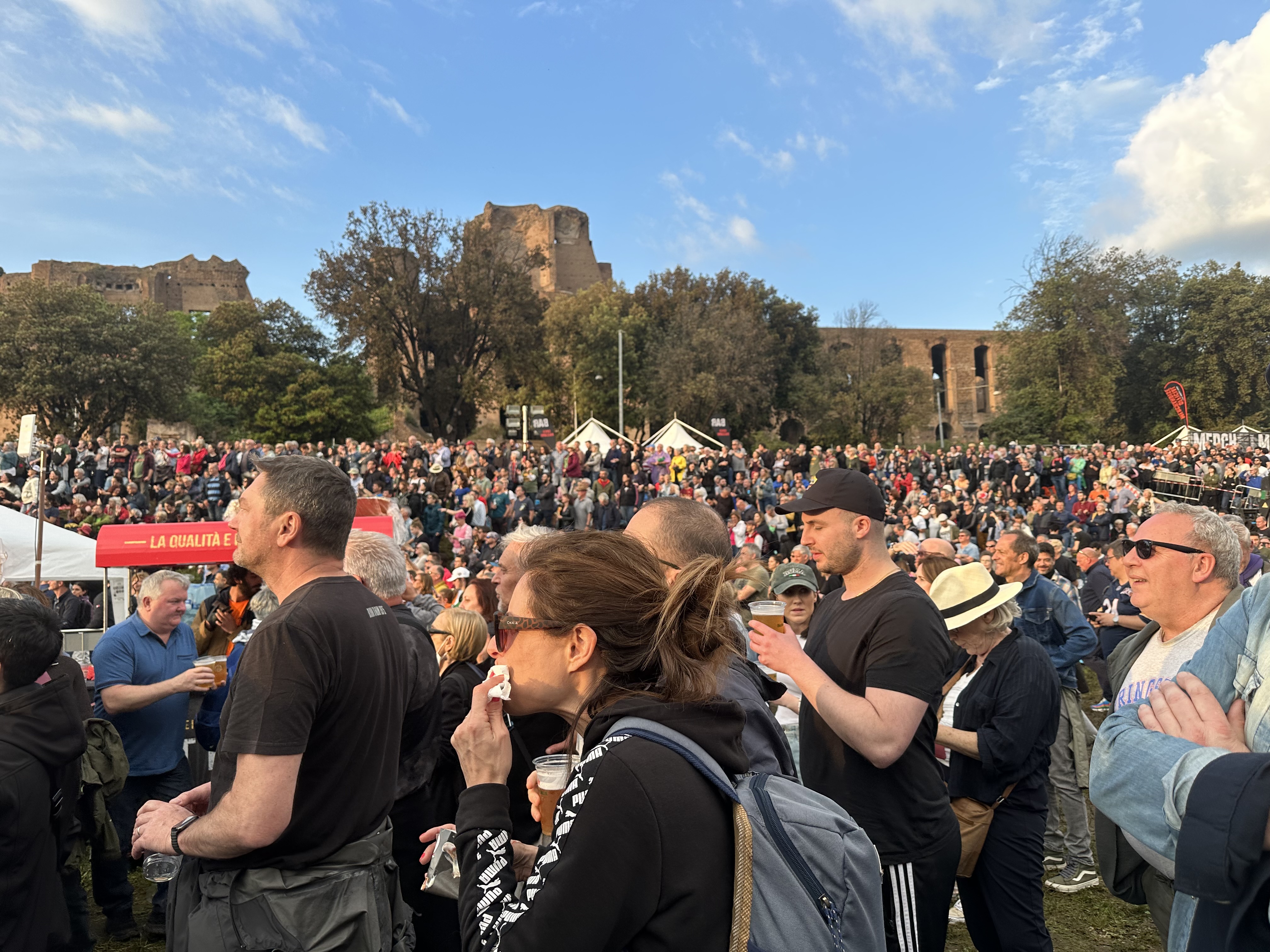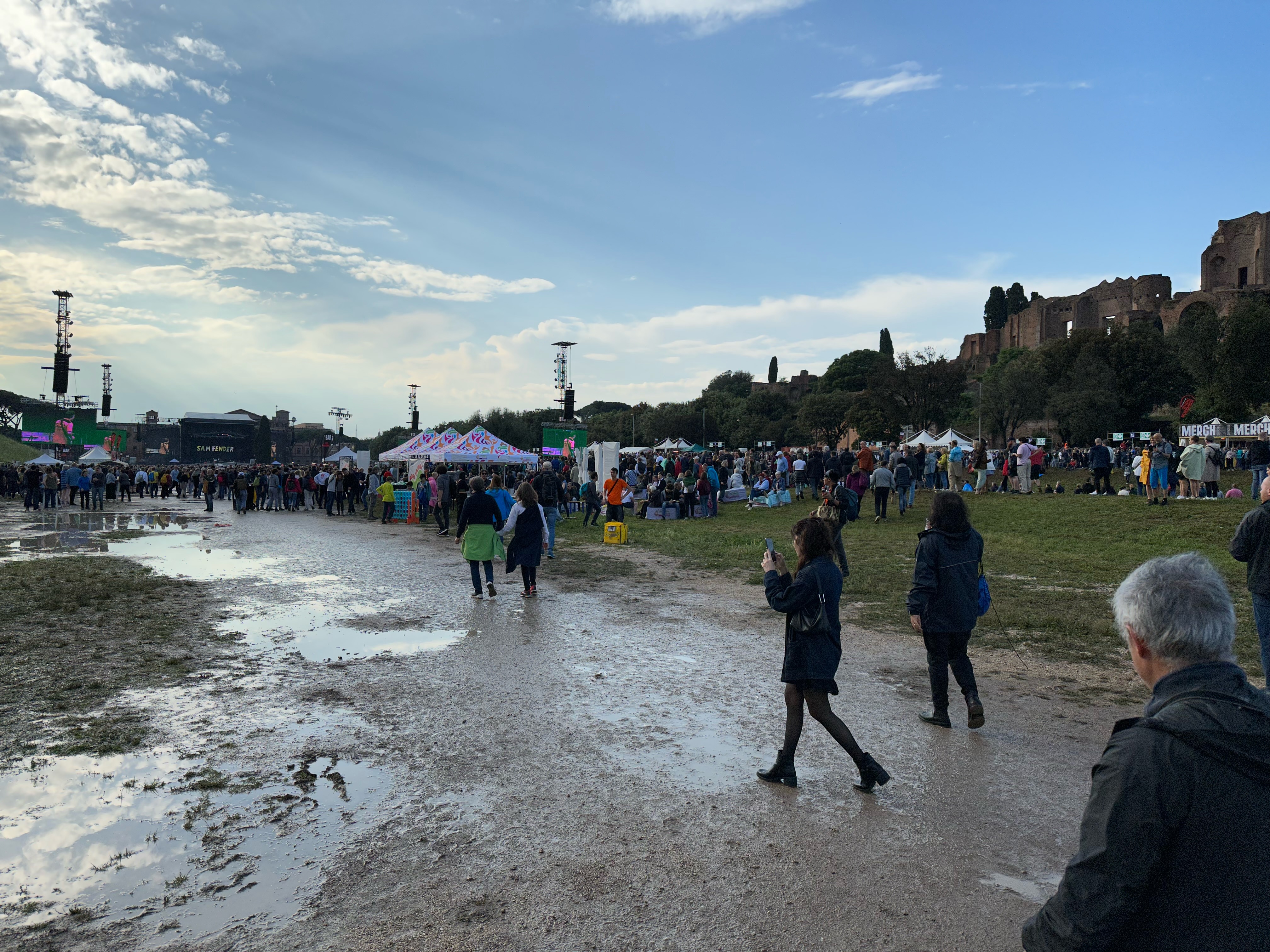 Like everyone else with general admission tickets, we had to walk the length of the Circus Maximus and enter towards the back. Italy had been experiencing quite a bit of rain — with tragic consequences. While Rome did not experience flooding like some other parts of Italy, it had enough rainfall to make the Circus Maximus a bit muddy. It made for a bit of squishy and mucky turf but, for us, it added a certain festival nature to the event. It did not rain on the concert, which made us all pretty damn happy.