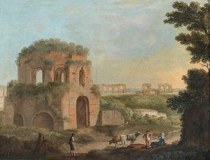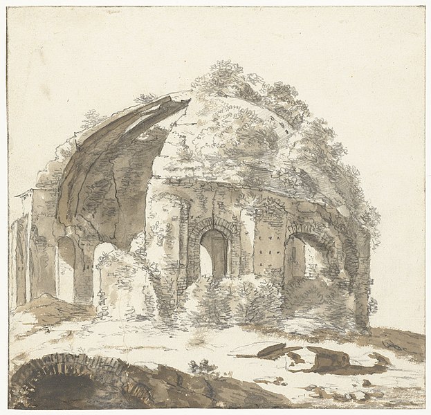 While you might drive or walk right past it today with scarcely a glance, this structure has been the subject of an amazing number of artists, who have depicted it as a magnificent, romantic ruin. I prefer these romantic depictions to its somewhat disappointing reality of today. The artistic depictions are not only beautiful but interesting as they show the nymphaeum over time — before its dome collapsed in 1828, and before the modern world was built up around it. To try and show those changes, I’ve posted some marvelous sketches, prints, and paintings in rough chronological order. The oldest, by Jacques Franckaert, circa 1585-1601, is at the top of this post.