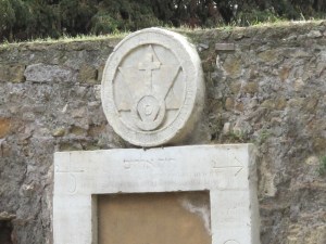 The second feature is much stranger. The “Magic Door” (a.k.a., the “Porta Alchemica”) is a marble doorway set into a wall, and the doorway is guarded by two statues of the little Egyptian god Bes. It’s all that remains of a villa built by Massimiliano Palombara, the Marchese of Pietraforte. Legend says the marchese hosted an alchemist who conducted experiments at the villa. He attempted to turn base metals into gold while there. But the alchemist vanished, leaving behind some gold flakes and a parchment of esoteric symbols and words. The marchese had them carved into the doorway in the hope that someone, someday, could decipher them.