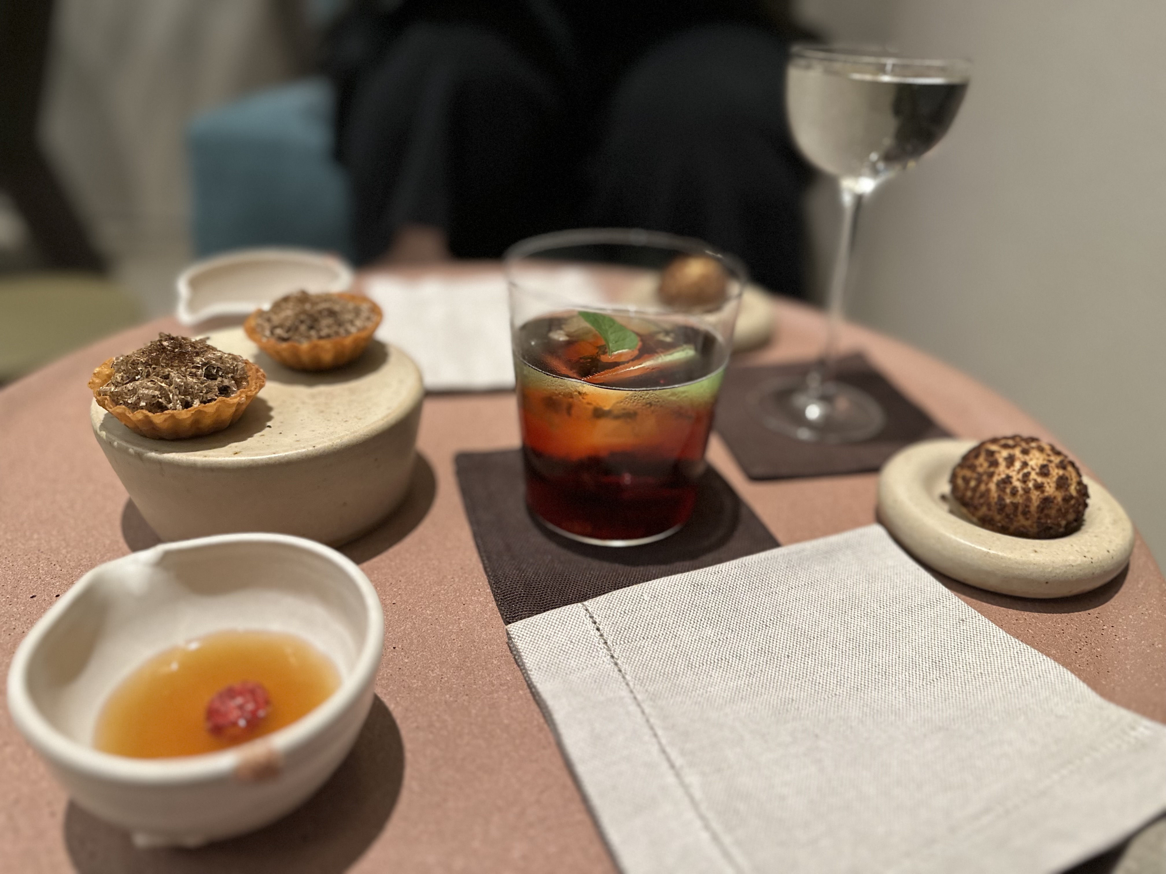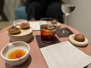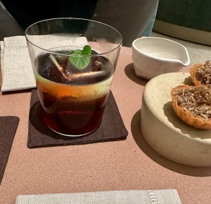 We then moved on to “Tomato Lulo and prawns.” Lulo is a Columbian fruit like a cross between a tomato and a lime. “Fregula,” a thin cut of veal over crispy, toasted semolina pasta, also joined the party. Filling things out was a new pair of cocktails — these inspired by the New World, a “Sage and Lemon” centered on tequila, and the “Smoke and Maracuja” with mezcal.