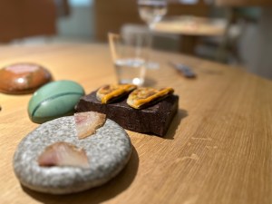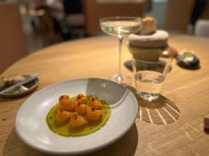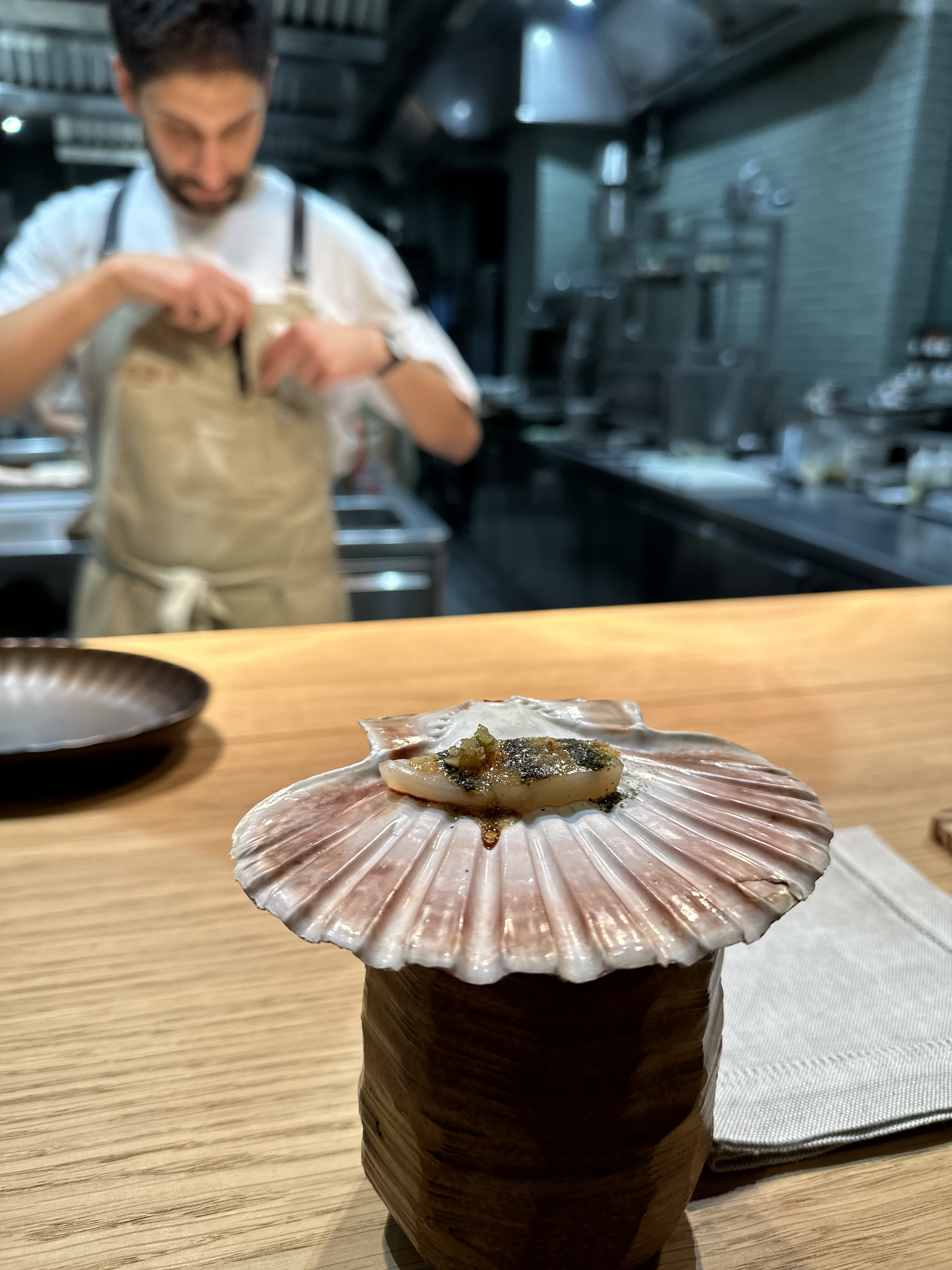 Mind you, this was all in what I’d describe as the restaurant’s anteroom. After our cocktails and introductory treats, we were shown to the window counter at the kitchen, where we chatted with the delightful sous chef and had a delectable raw scallop, which we washed down with a tart fruit juice — basically, a perfect little ceviche in your mouth!