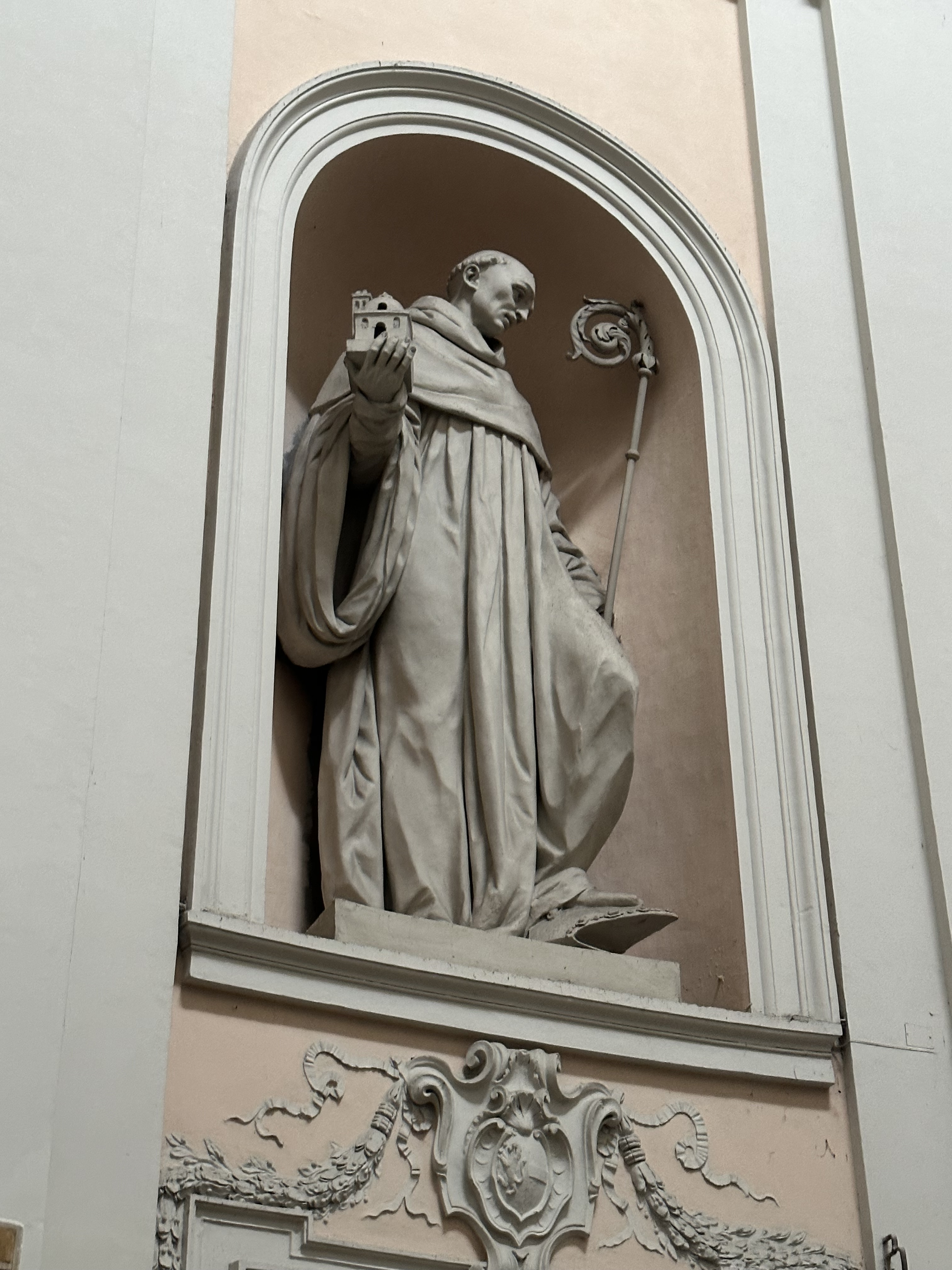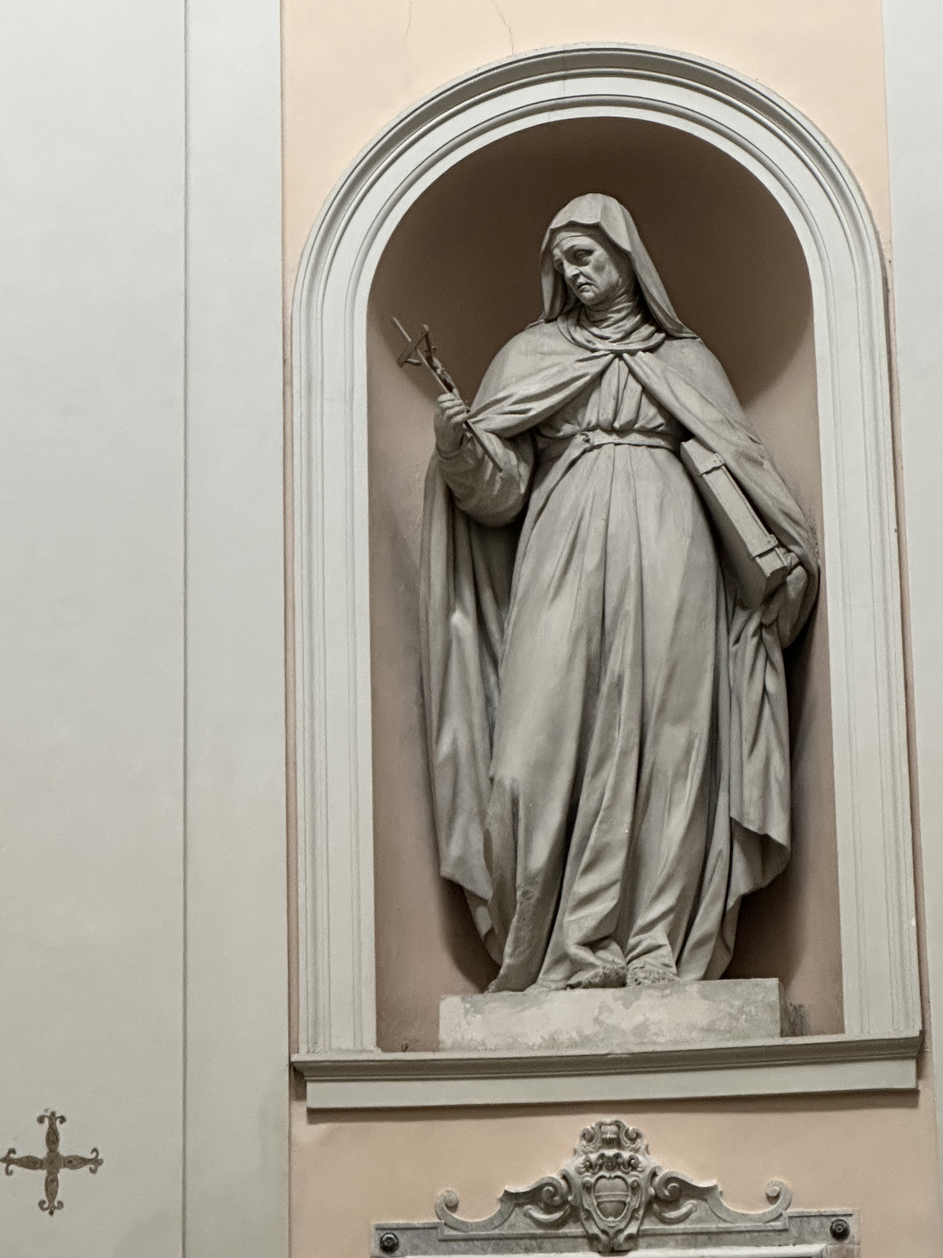 Eight enormous (over three meters tall) stucco statues by the sculptor Camilllo Mariani stand in niches that go around the interior.