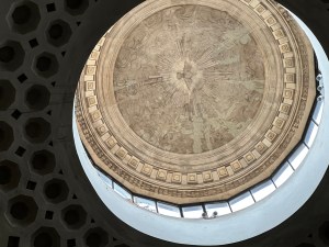 The ceiling takes your breath away. Made of stucco, it’s composed of coffered octagons that diminish in size as they approach the top of the dome — a sort of trompe l’oeil to make the dome seem more voluminous. Despite the fact that there are no windows in the church, the interior is surprisingly bright, because natural light streams from the large circular hole (impluvium) in the center of the dome.