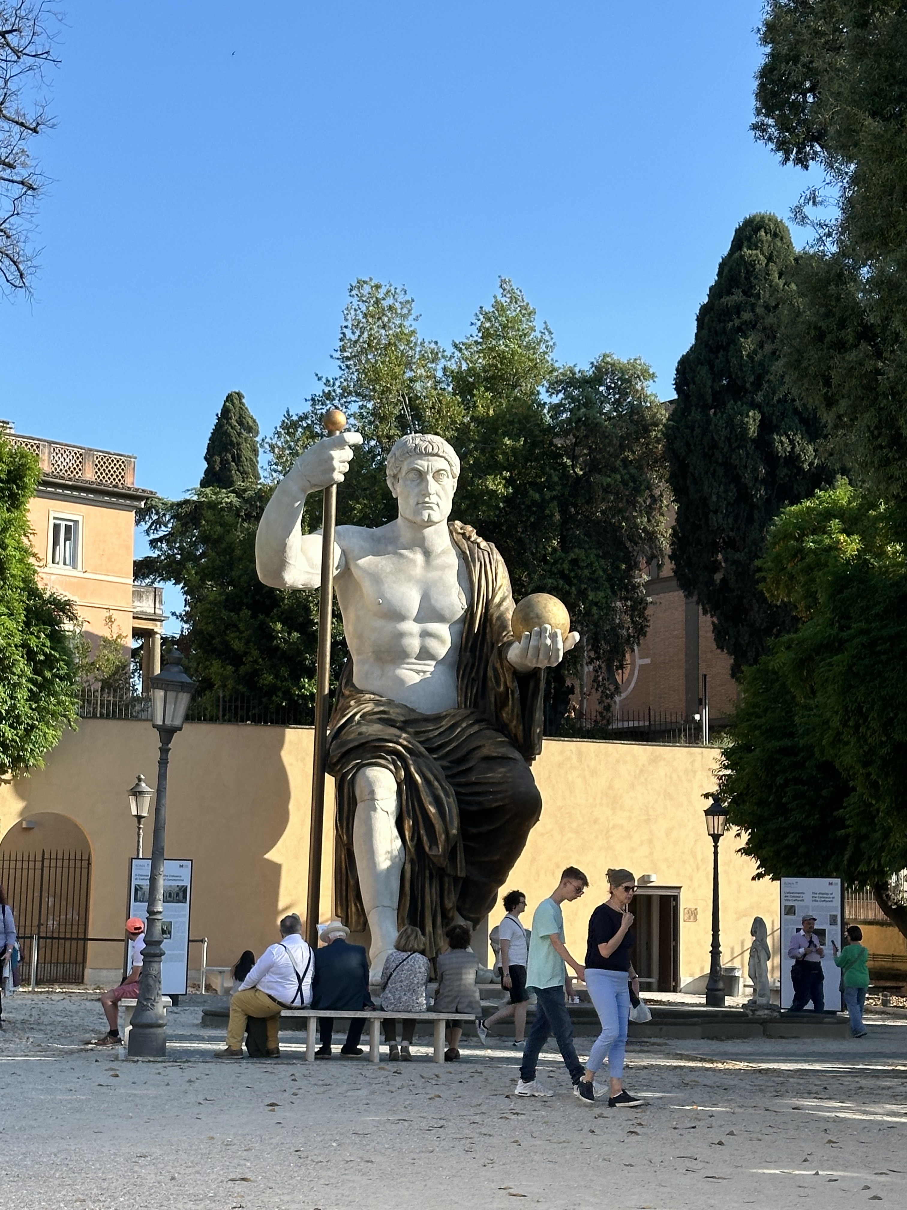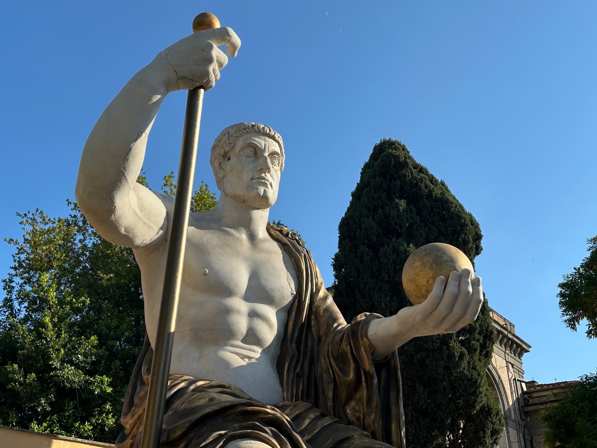 But now the statue has been re-created. The 13-meter high statue depicts the regal emperor, seated, wearing a draped, gilded toga, and holding a scepter and orb. Fittingly, he’s sitting in a courtyard of the Capitoline Museums. And boy, does he look good — clearly he works out and watches the carbs!