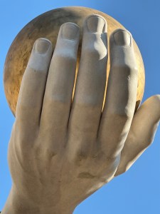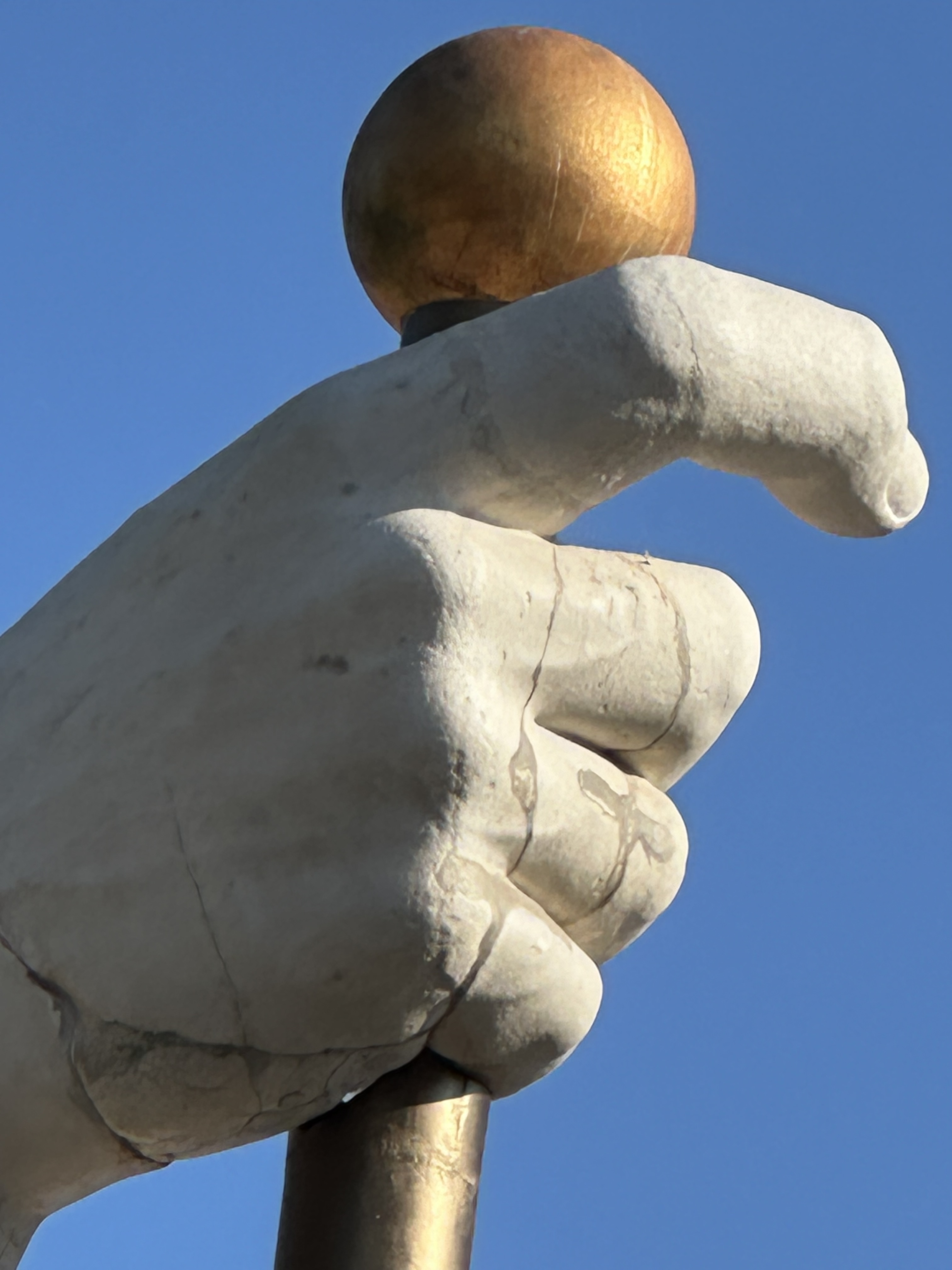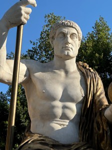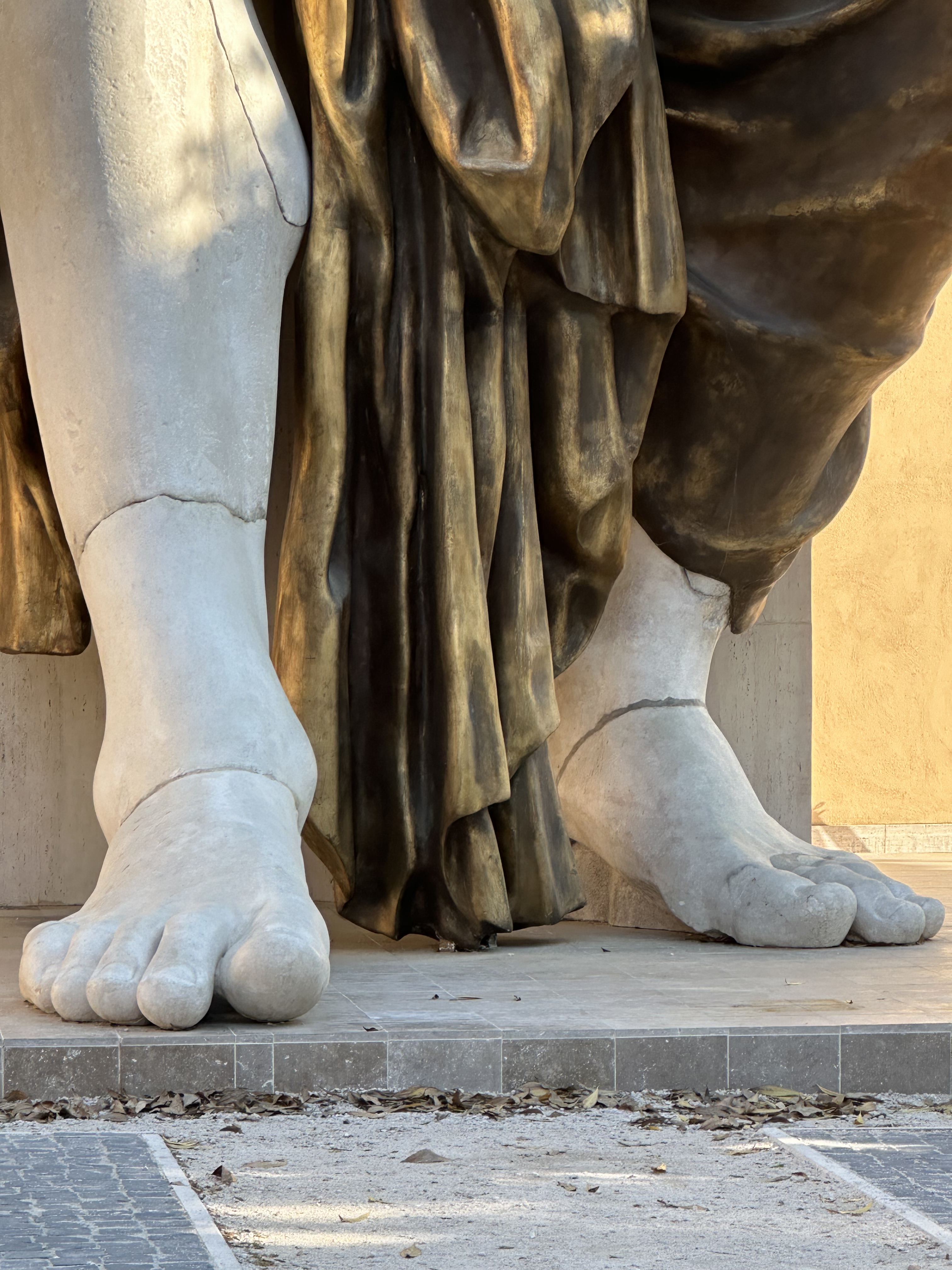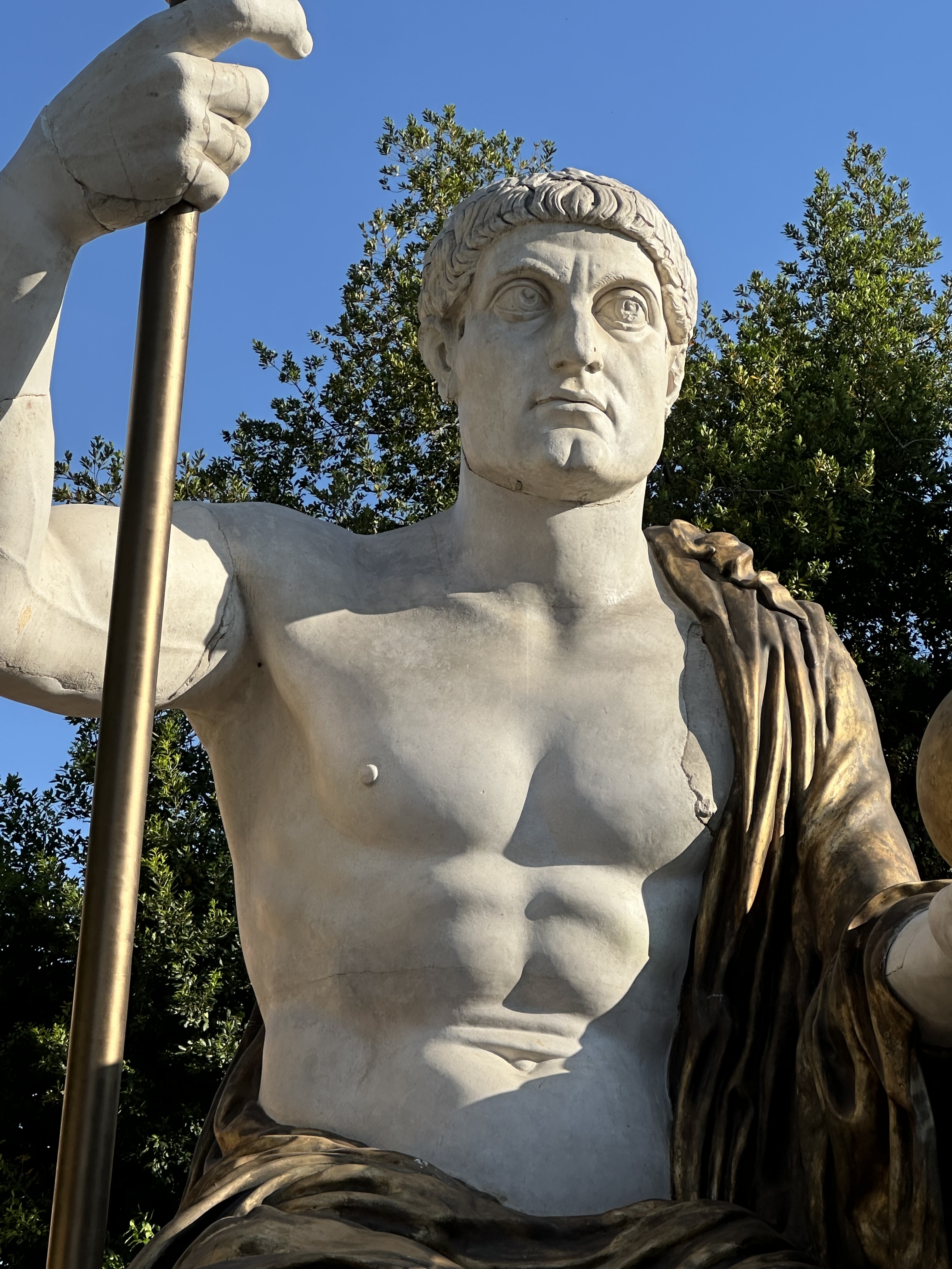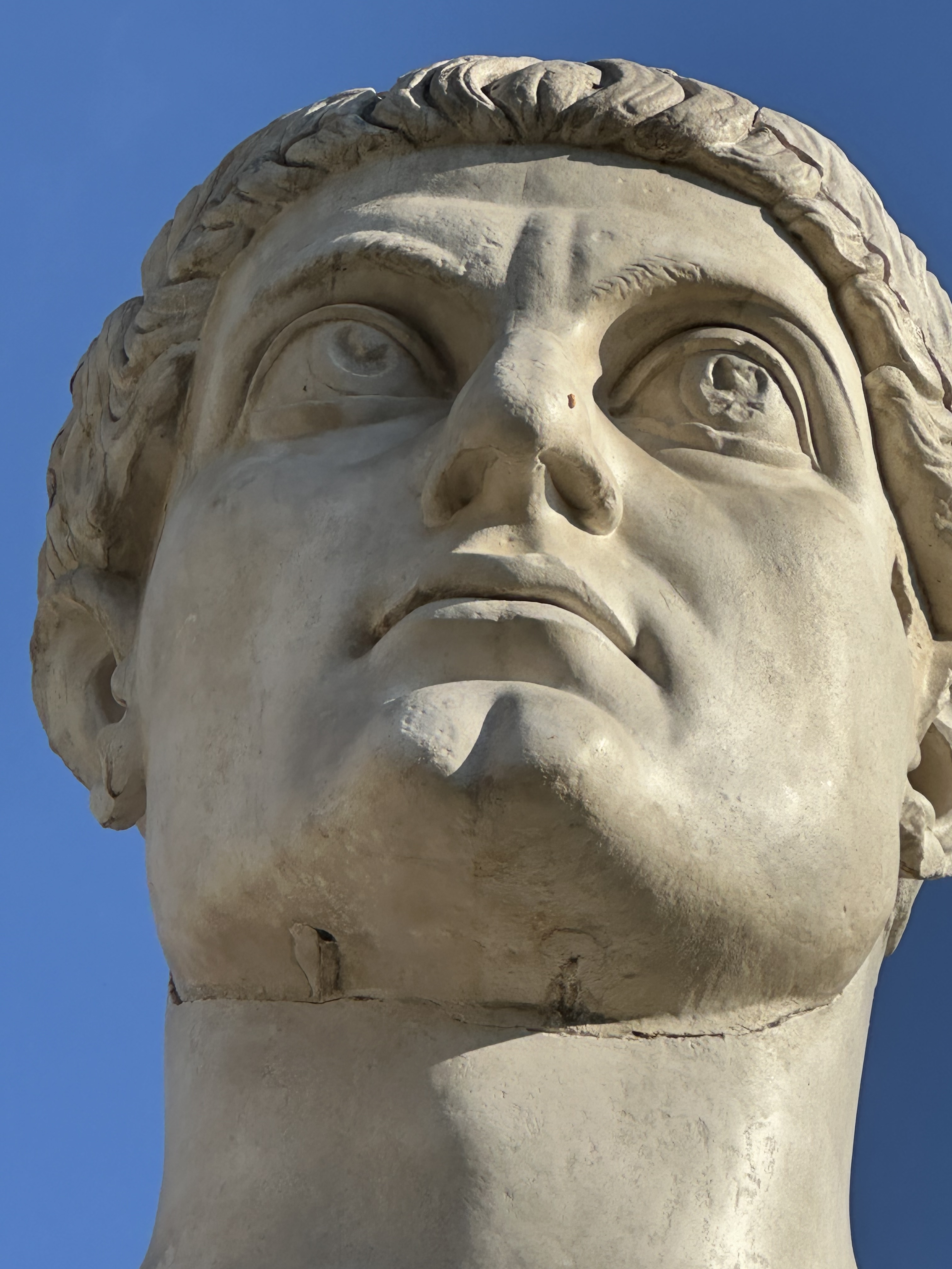 Back in the day, a gigantic statue of the emperor Constantine (“the Great”), who ruled from 306 to 337 C.E., sat in the apse of the Basilica of Maxentius and Constantine in the Roman Forum. (The basilica was started by Maxentius, who was Constantine’s one-time co-emperor, and who Constantine killed at the Battle of the Milvian Bridge.) Pieces of that massive statue — Constantine’s marble head, hand, shin, feet, and a few other bits — now rest in the Capitoline Museum’s courtyard, where they have been since 1471.