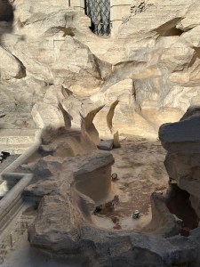 With the basin drained, you can see details you would not normally be able to (or perhaps you just would not notice) if the fountain was operating. For example, there are these lovely plants that would be “growing” out of the basin, as if growing along a pond.