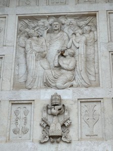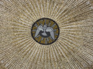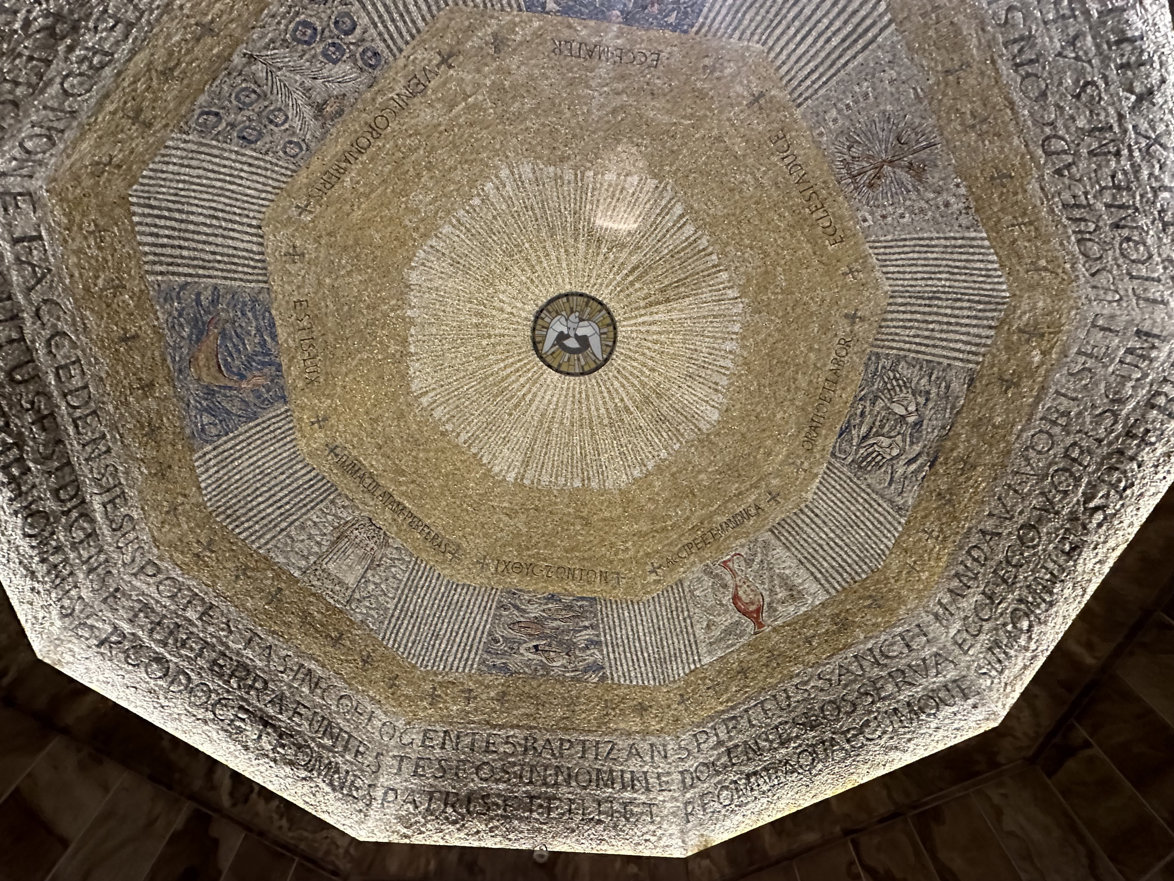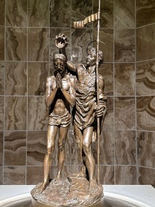 Off to one side is the baptistry, with a beautiful mosaic dome. The baptismal font, by Andrea Spadini, depicts the baptism of Jesus.
