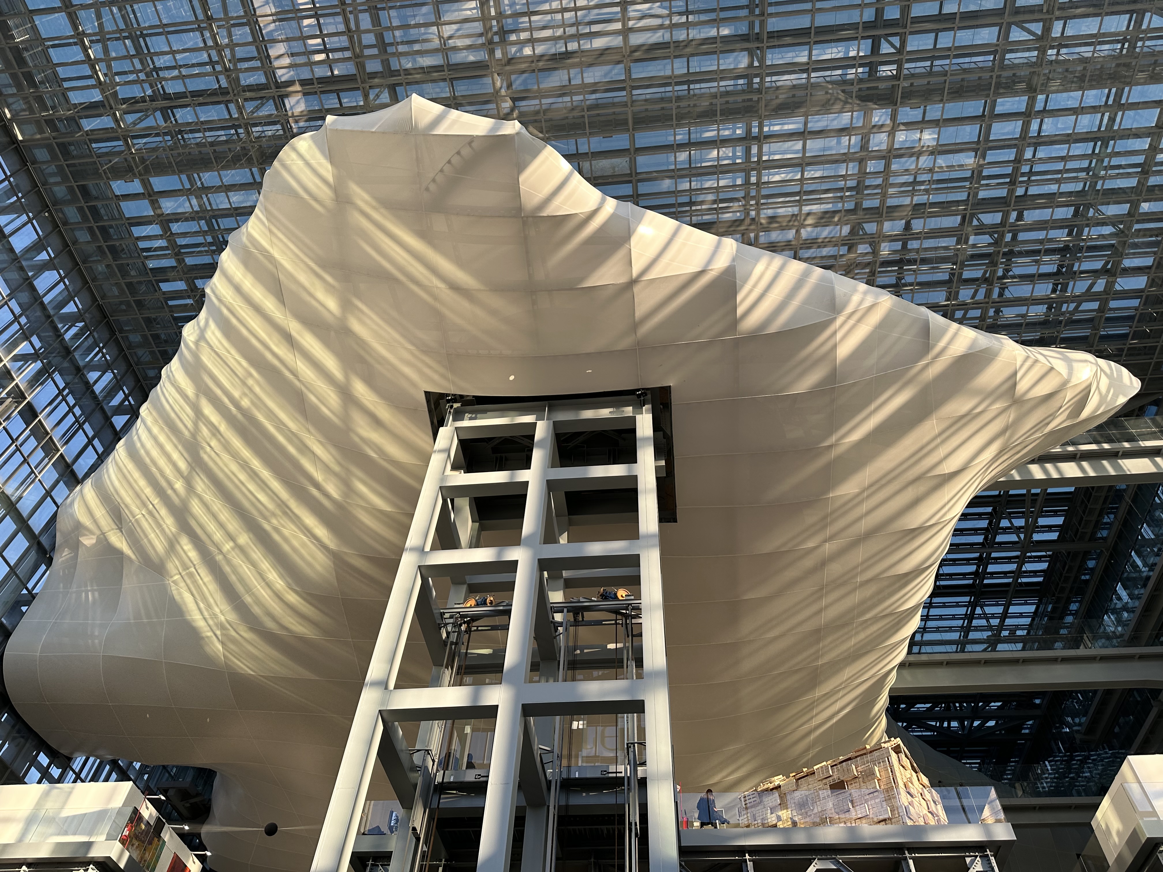 The Cloud itself hovers above the exposition space. We took the escalator up to it, where we could see personally just how cool it is inside The Cloud. We enjoyed wandering around and exploring its undulations and three-dimensional curves. We saw tons of people exploring and enjoying the space just as we were.