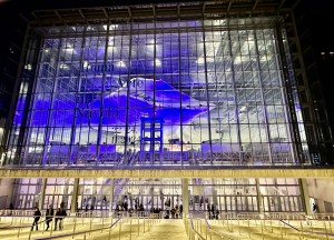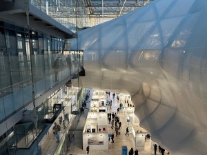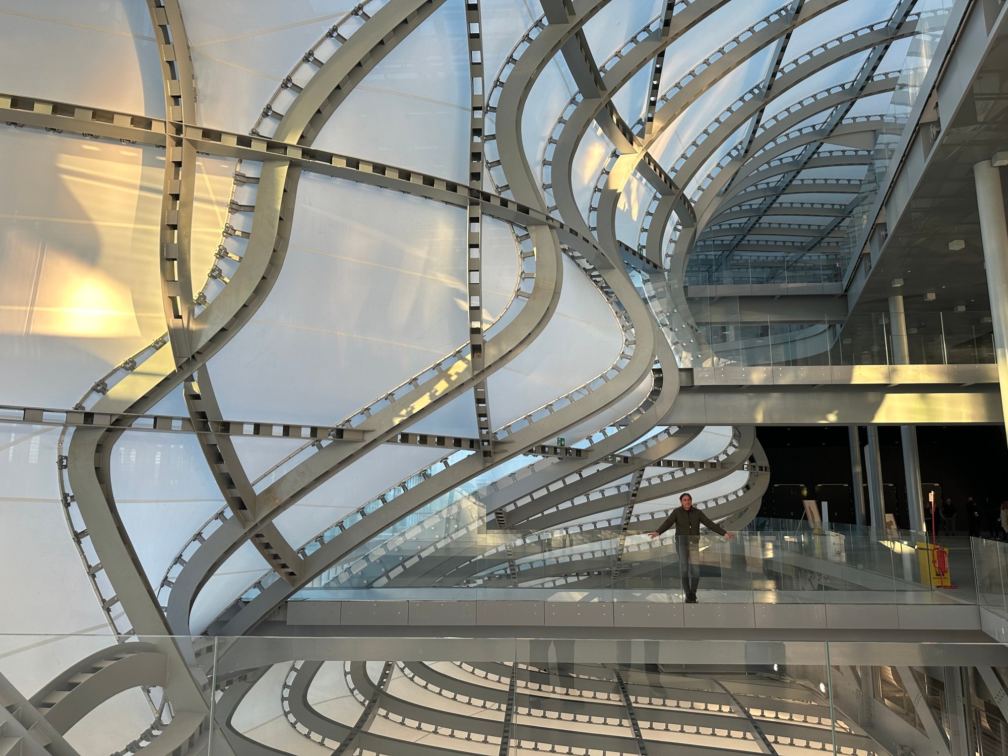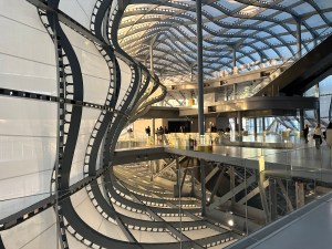 It was finally completed in 2016, in Rome’s EUR area. The complex actually consists of three sections: The Teca (Shrine), the large glass “box” surrounding The Cloud; La Nuvola (Cloud) itself, which houses an auditorium and other spaces; and The Lama (Blade), a giant, shiny black hotel space off to one side. But you can’t just walk in and enter The Cloud any time you want. Instead, you have to wait for an event. We lucked out during our last stay. The modern art fair, Roma Arte in Nuvola was taking place (it’s an annual event, scheduled for November 21-23, 2025). Getting inside The Cloud for an art show? Definitely a win-win, in our opinion.