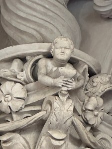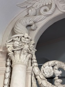 A laurel and flower festoon is draped between the capitals, which, together with the upper ornamentation creates an oval shape reminiscent of his work at San Carlo alle Quattro Fontane and elsewhere. The decoration is weird, unexpected, untraditional, and tremendous.