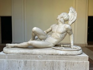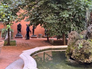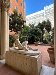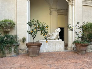 Our visit started with the palazzo’s pretty little courtyard, filled with sculpture. The courtyard is marginally visible from the side street through a thicket of gate-climbing vines.
