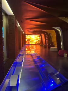 When you arrive at the hotel — which is gorgeous — you go down a slightly optically illusional curving corridor to the restaurant. There, the curvilinear motif continues. The walls are dark with curved elements, the ceiling consists of curve-stitched rectilinear metal, while the gigantic kitchen is in full view with its white marble. The whole place is visually stunning.