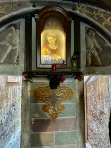 We were out walking one day. Laura pauses to look at a Madonnella, which you can see in the upper left of the photo below. Then we spot a strange arched passageway. Because David can never pass up an opportunity for a short cut, we have to check it out.