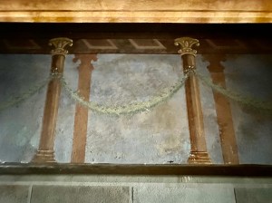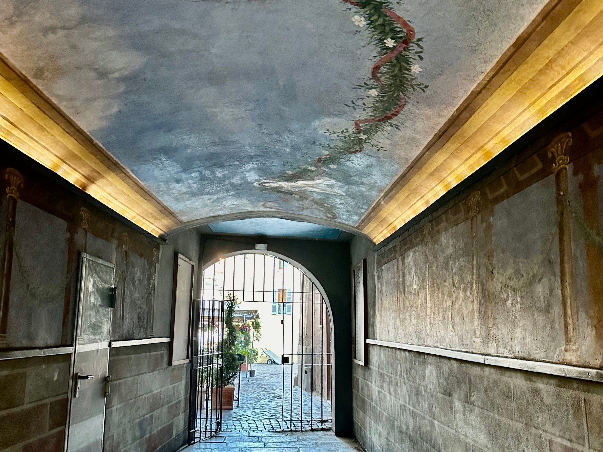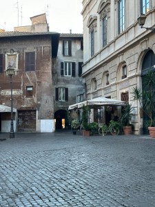 We find ourselves standing in an unexpectedly pretty passageway, with frescoes on the ceiling (shown in the photo at the top of this post) and walls. It’s known as the Passetto del Biscione. We had read about it, but never found it before. In ancient times, the passage led to the Theater of Pompey. Today, it’s a shortcut to or from Campo de’ Fiori.