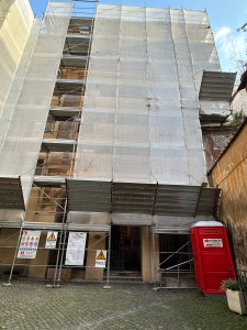 But then we listened… and heard singing coming from the building with the scaffolding.