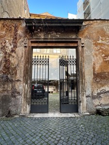 Here’s another example. We encountered an open gate: it led to a little alley, at the end of which was what once must have been an elegant entrance, surmounted by an arch. In we go …